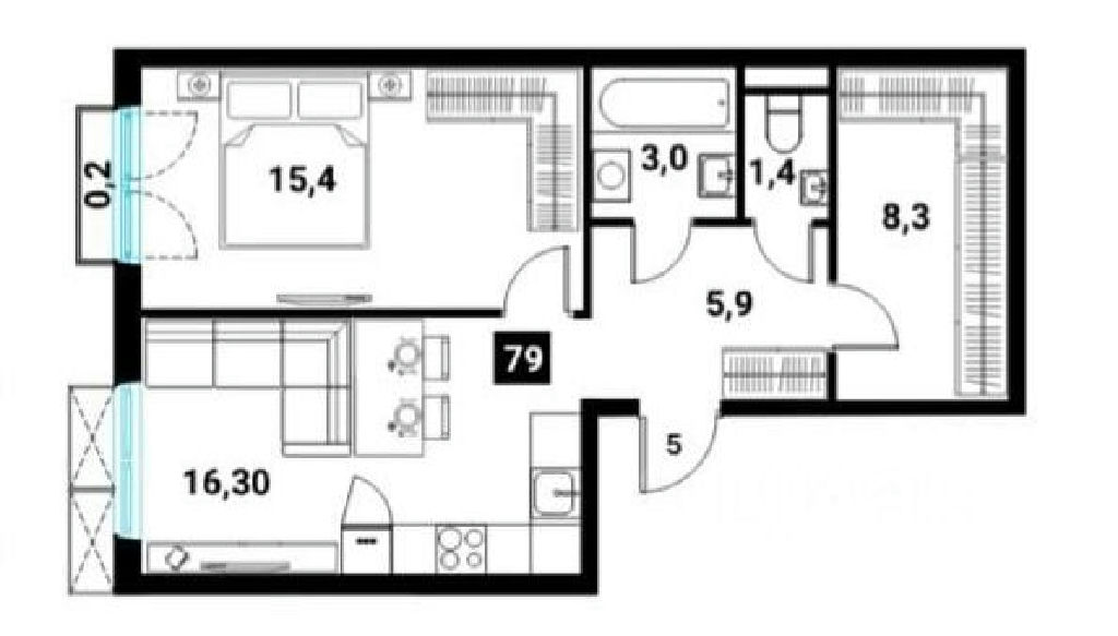 Планировка включает в себя: кухня-гостиная 16,3кв.м., изолированная спальня 15,4кв.м., гардеробная комната 8кв.м., совмещенный санузел, балкон, высокие потолки 3м.